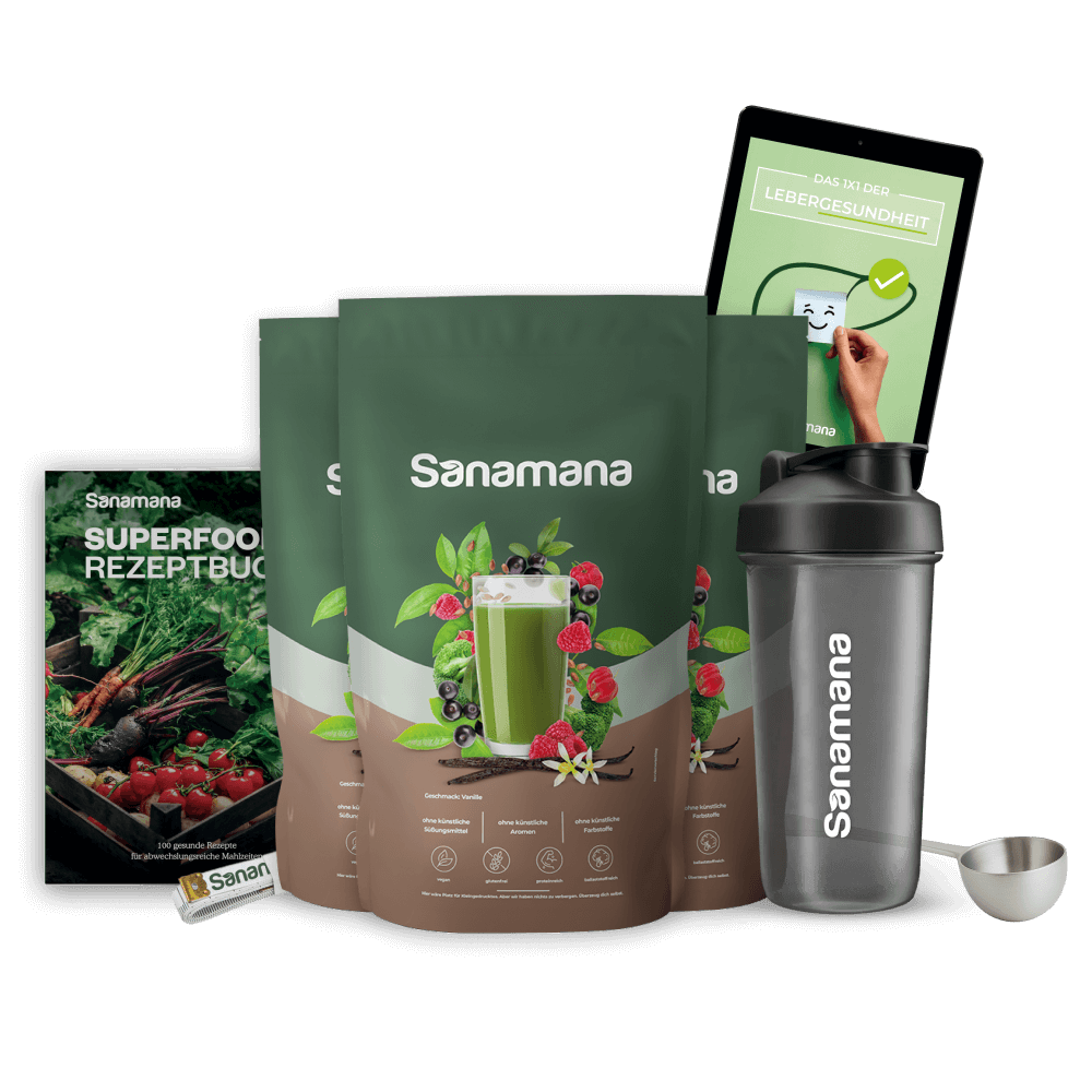 Neben dem Sanamana-Shake kannst du frisches Gemüse, gesunde Fette (z. B. aus Nüssen, Avocados oder Leinöl) und eiweißreiche pflanzliche Lebensmittel in deine Mahlzeiten integrieren. Im Superfood-Rezeptbuch findest du zahlreiche Gerichte, die du ohne Bedenken zu dir nehmen kannst.